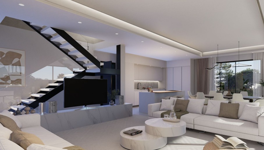 De entree van de villa komt uit in een ruime hal met kasten, die leidt naar de ruime woonkamer met open keuken met een geïntegreerd kookeiland. Grote energiezuinige ramen van vloer tot plafond geven u direct toegang tot het zwembad en de tuin. Er is ook een gastentoilet op de begane grond.