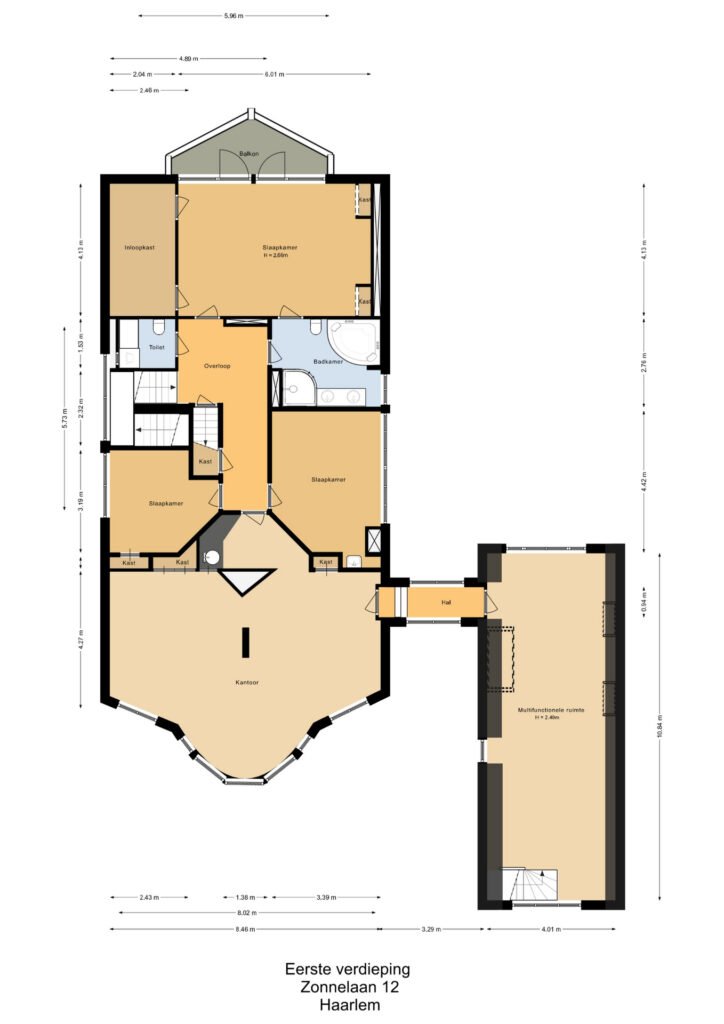 Spacious landing with separate toilet and staircase cupboard, generous master bedroom at the front spanning the entire width of the house, walk-in wardrobe and access to the balcony, two bedrooms on either side of the landing and a fourth room (formerly two rooms) at the rear, now used as an office. This room boasts a large round bay window with stunning views over the Spaarne. Bathroom with corner bathtub, bidet, walk-in shower and vanity unit with two washbasins. There is a thatched air bridge from this floor to the adjacent office with a room underneath with a wash basin, toilet and side entrance. Separate room with windows on the front side. A built-in staircase leads to two basement rooms.