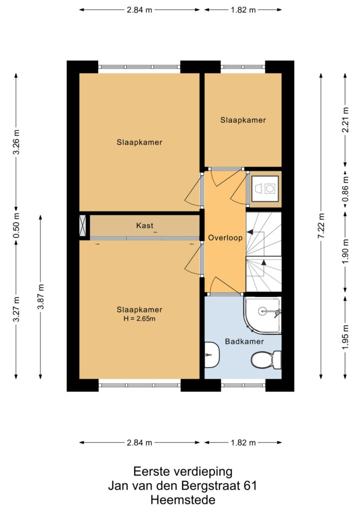 Ruime overloop met kast met wasapparatuur, twee slaapkamers aan de achterzijde en een zeer royale slaapkamer met kastenwand aan de voorzijde. Badkamer met douche, wc en wastafel.