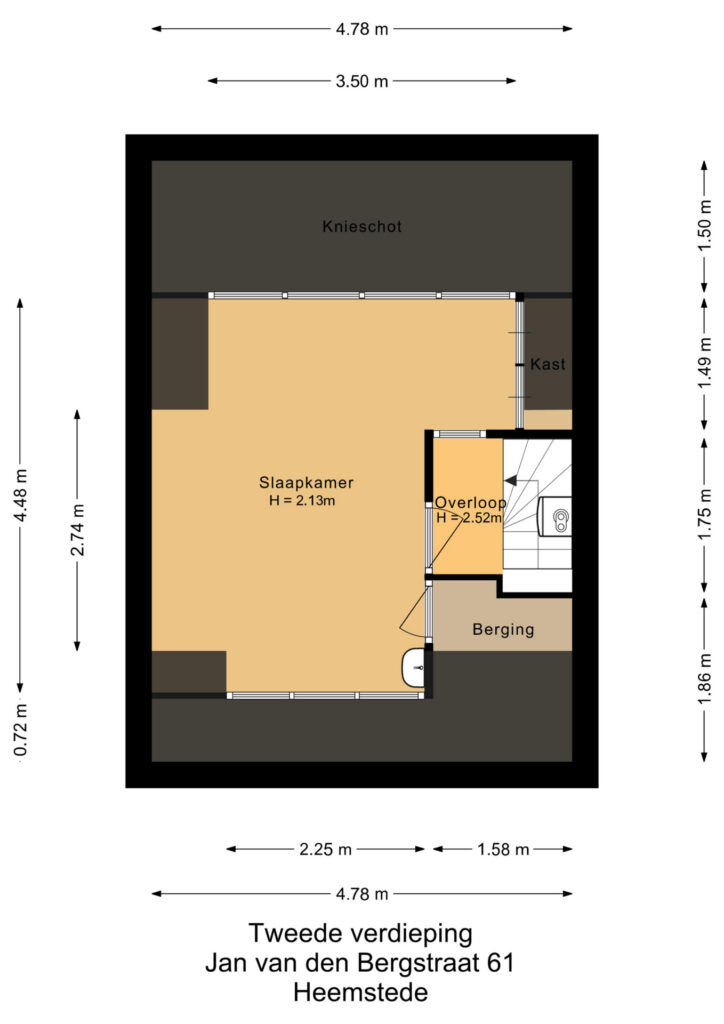 Overloop, grote slaapkamer met 2 grote dakkapellen, waarvan de kapel aan achterzijde over de gehele breedte van de kamer. Deze kamer kan gesplitst worden om een 5e slaapkamer te realiseren. Er is bergruimte achter de knieschotten en een extra berging. C.V. ketel in trapgat.