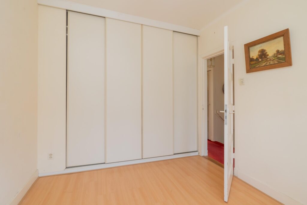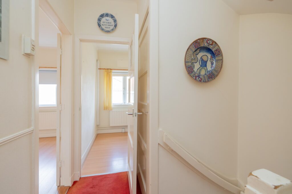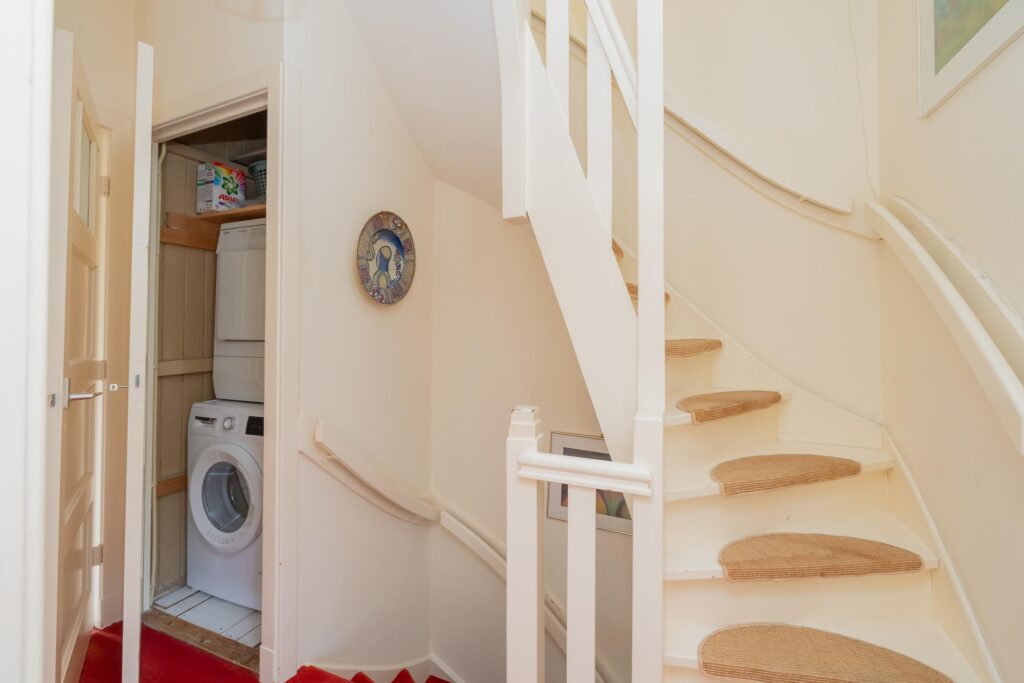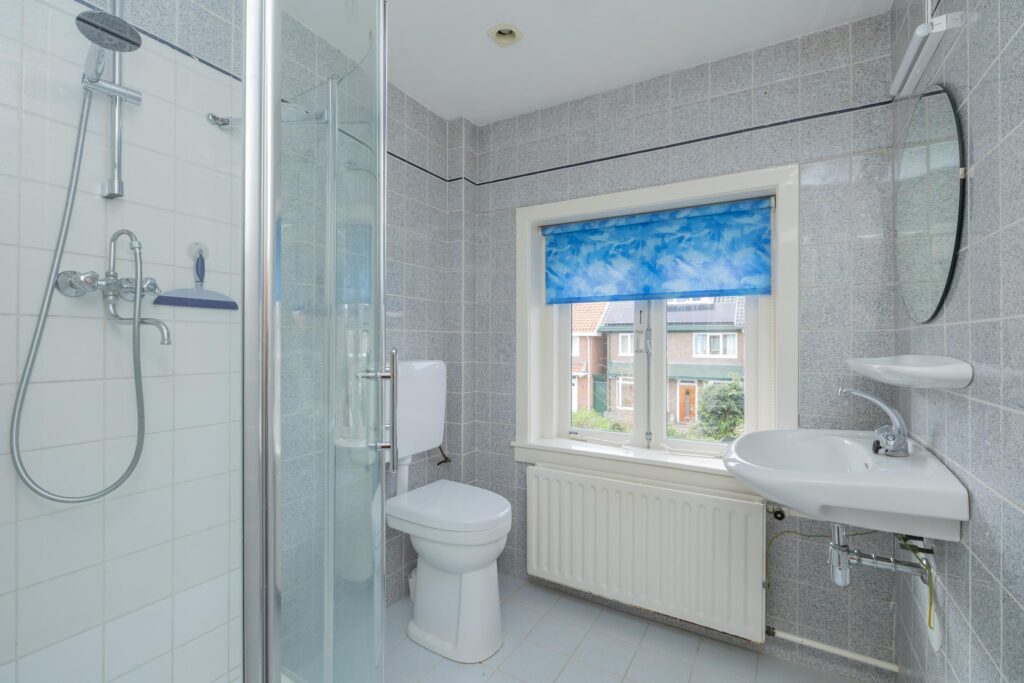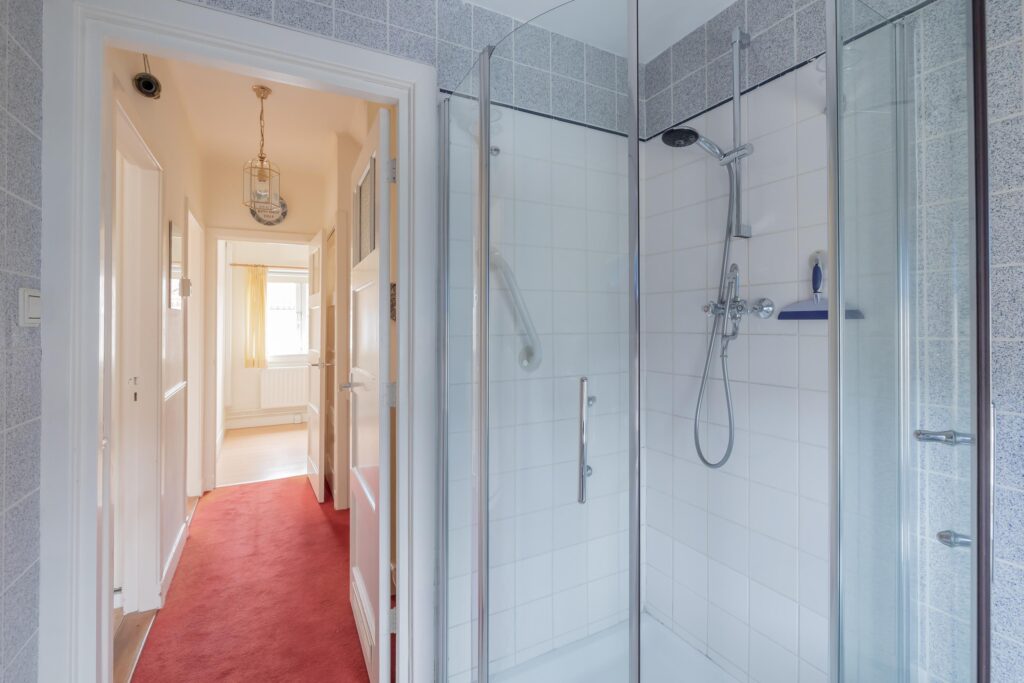 Ruime overloop met kast met wasapparatuur, twee slaapkamers aan de achterzijde en een zeer royale slaapkamer met kastenwand aan de voorzijde. Badkamer met douche, wc en wastafel.