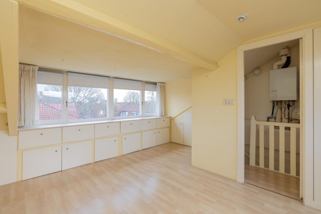 Overloop, grote slaapkamer met 2 grote dakkapellen, waarvan de kapel aan achterzijde over de gehele breedte van de kamer. Deze kamer kan gesplitst worden om een 5e slaapkamer te realiseren. Er is bergruimte achter de knieschotten en een extra berging. C.V. ketel in trapgat.