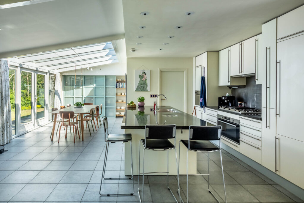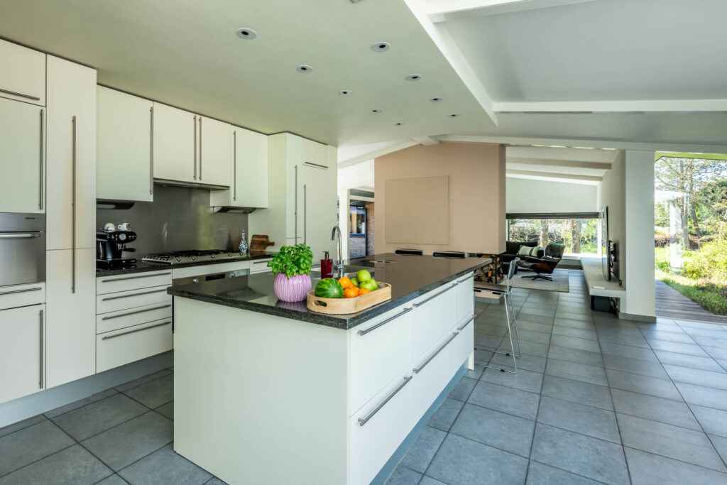 De royale woonkeuken biedt via openslaande deuren toegang tot de achtertuin. Naast de keuken bevindt zich een praktische bijkeuken met aansluitingen voor wasapparatuur en de opstelling van de cv- ketel. Vanuit hier heeft u tevens toegang tot de kelder met stahoogte en de aangebouwde garage.