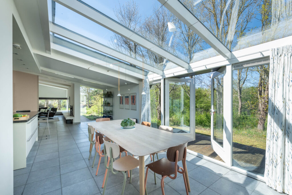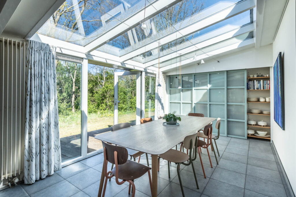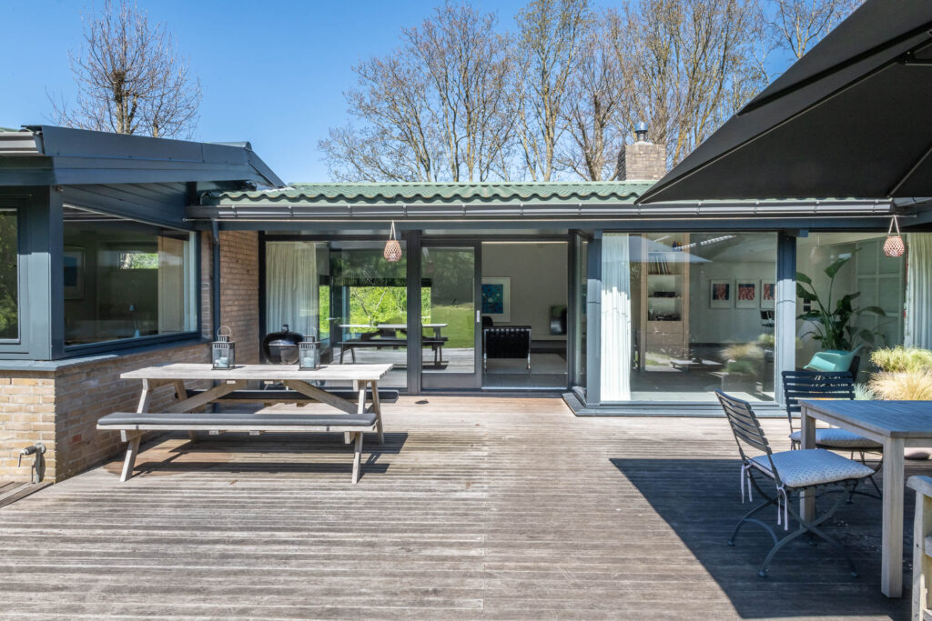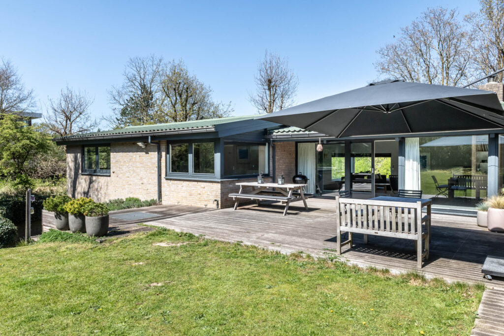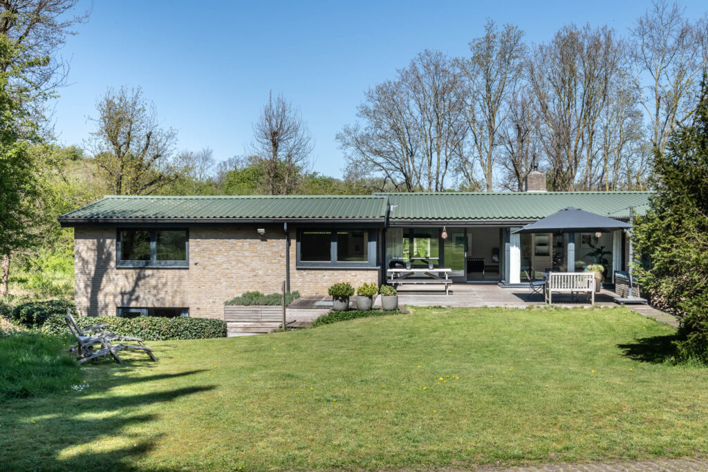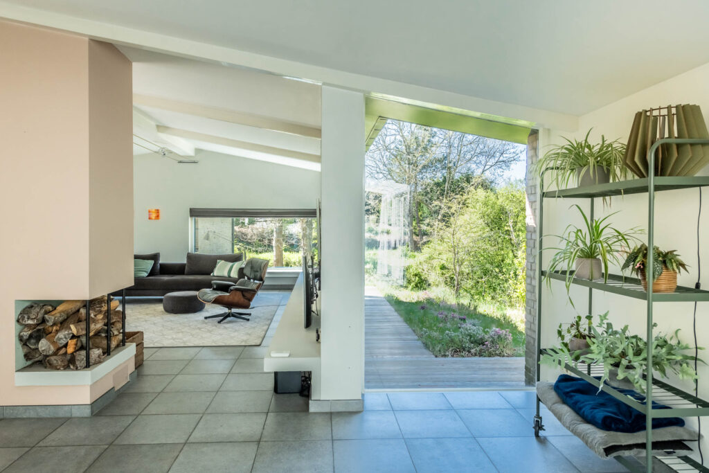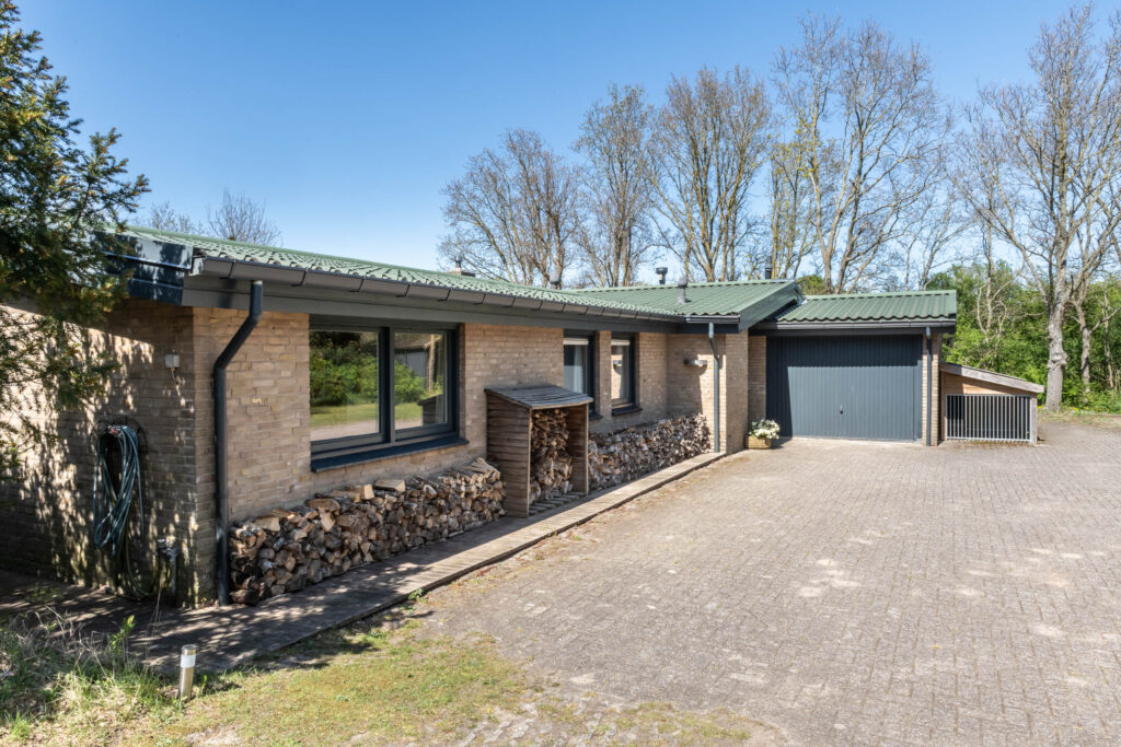 Entrance, large hall with coat closet, WC with a sink and sliding door to the spacious living room. Thanks to the large windows and two sliding doors, the living room is wonderfully light, and there is a lovely view of the surrounding dune garden. The living room opens directly onto the sunny terrace. The living room also holds a well-functioning wood-burning stove.