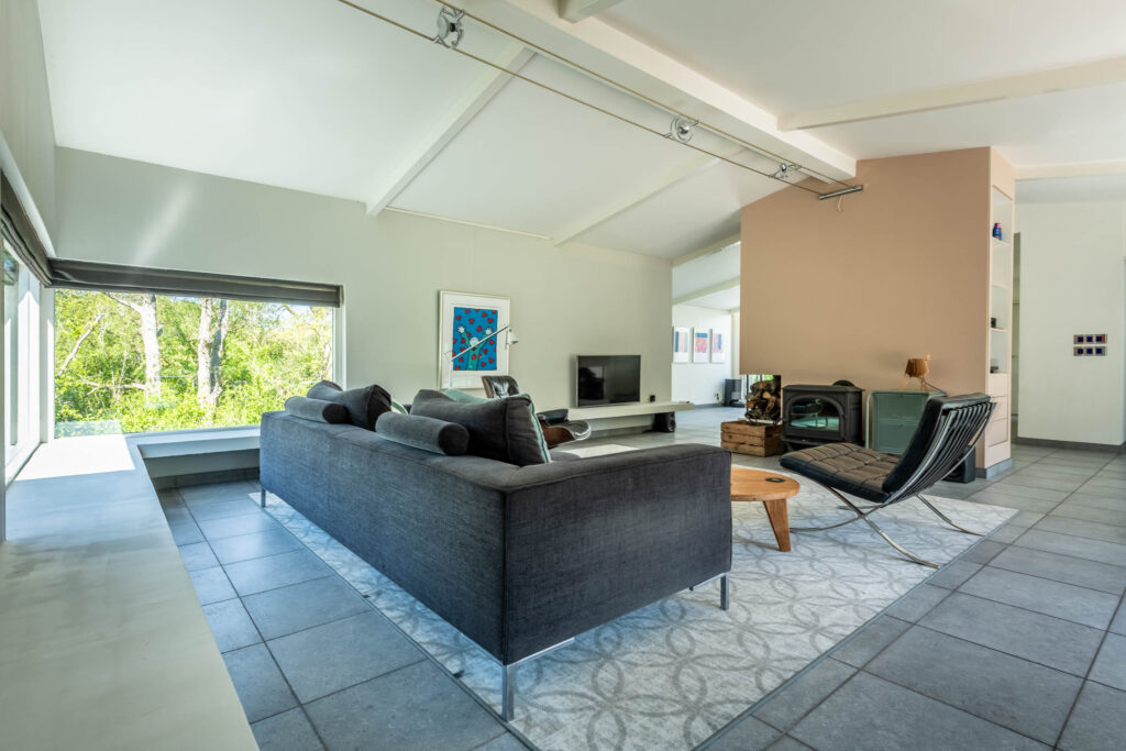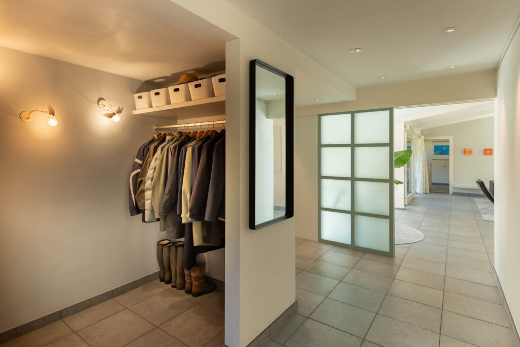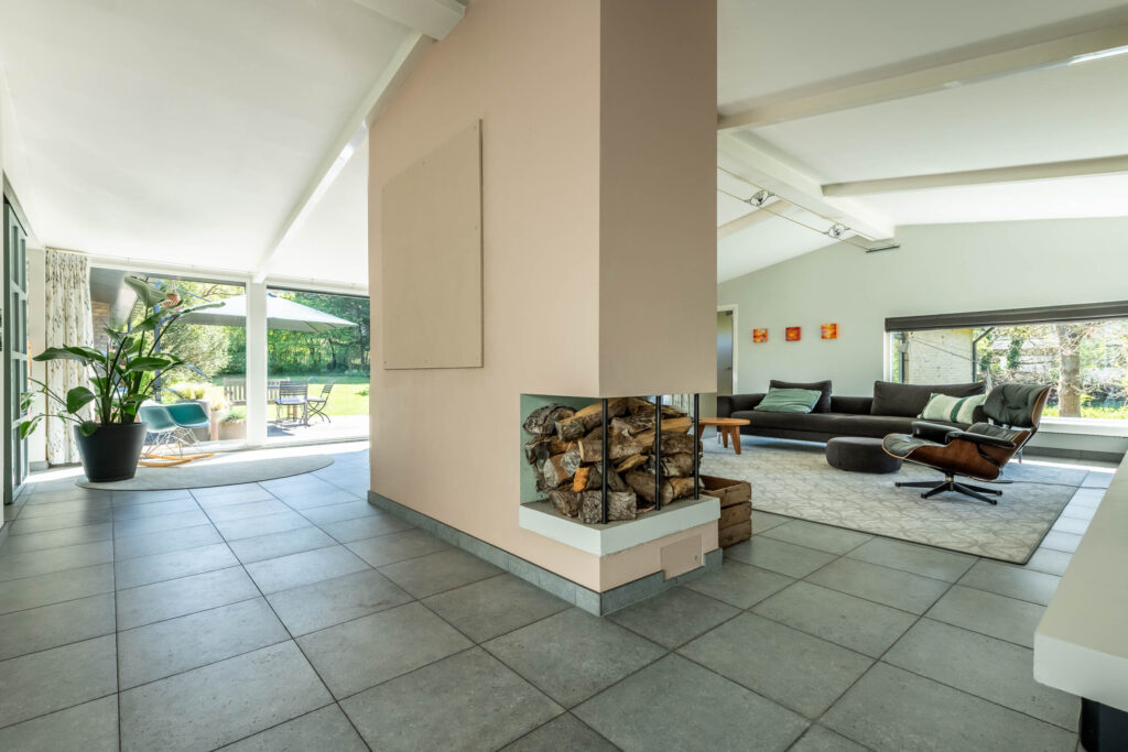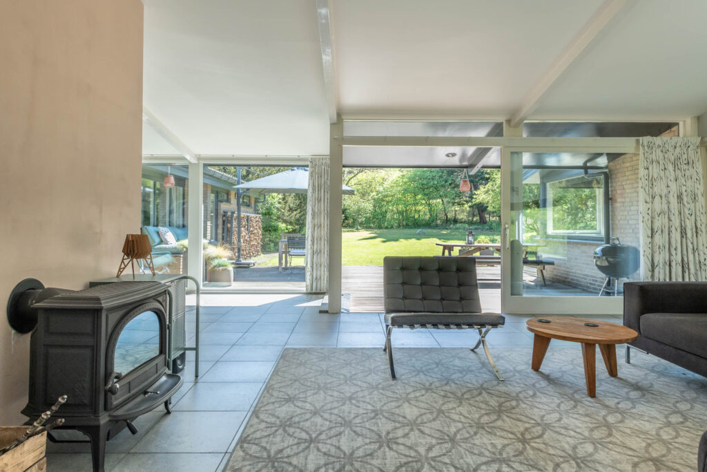 Entree, ruime hal met garderobe, wc met fonteintje en schuifdeur naar de riante woonkamer. Dankzij de grote raampartijen en twee schuifpuien is de woonkamer heerlijk licht en is er een prachtig uitzicht op de omliggende duintuin. Vanuit de woonkamer loopt u zo het zonnige terras op. In de woonkamer is tevens een goedwerkende houtkachel aanwezig.