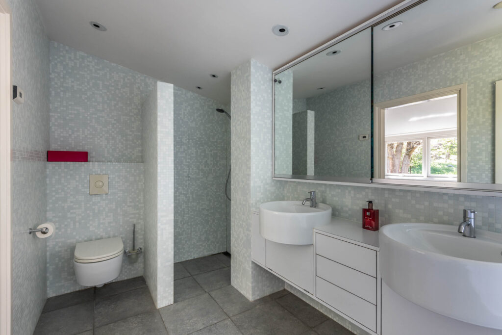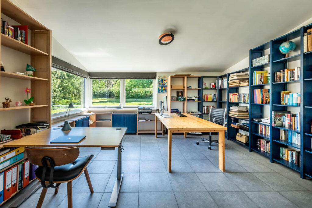 Aan de achterzijde: een ruime studeerkamer en masterbedroom met walk-in-closet en aangrenzende badkamer met wc, douche, bad en dubbele wastafel.
