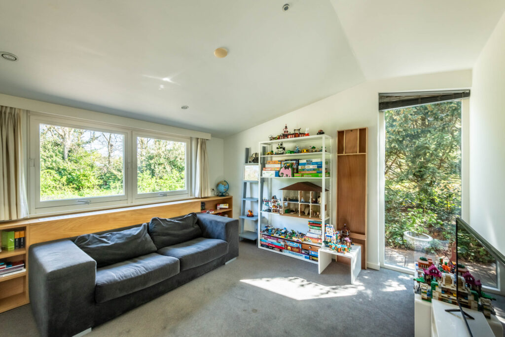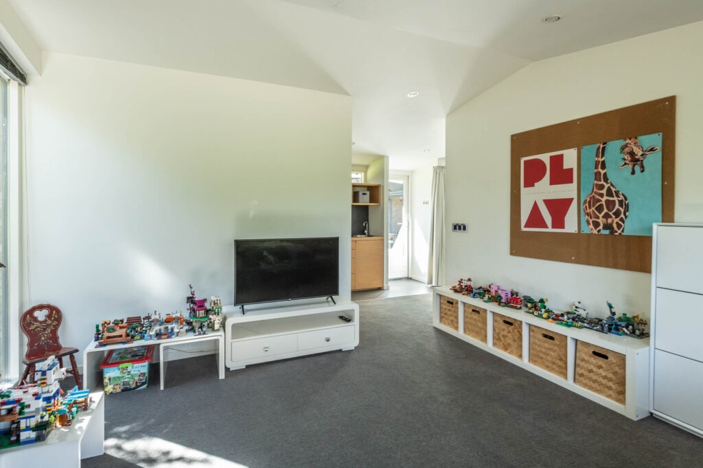 Large playroom/guest room/studio with storage space and a bathroom with shower, toilet and sink. A door grants access to a terrace. This can also be used as a separate entrance to this room/studio. There is also a small space here for the central heating boiler.
